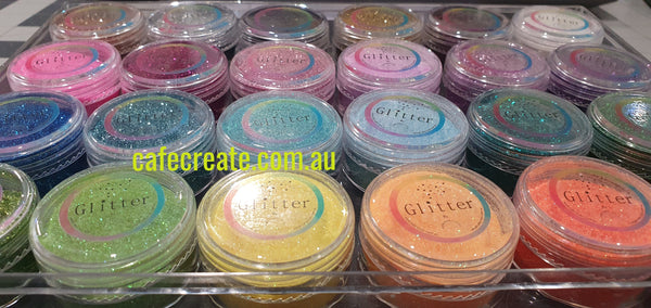 24 X 10ml (approx. 6g) ultra fine glitters (Metallic and Iridescent)